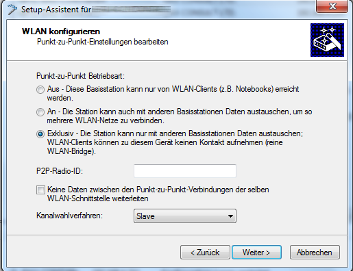 Es empfiehlt sich aus Sicherheitsgründen und aufgrund der eng spreizenden Fresnelzone der Richtfunkstrecke diese exklusiv einzurichten, das bedeutet, nur die 2 LANCOM OAP-321 kommunizieren miteinander, eine Anmeldung anderer WLAN-Clients an der WLAN SSID ist nicht möglich.