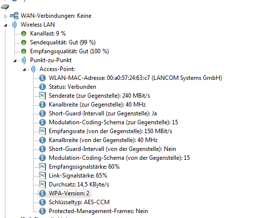 Steht die Verbindung und hat der OAP-321 eine Verbindung zur Gegenstelle, ershceint im LANmonitor ein Eintrag "Punkt-zu-Punkt", welcher die technischen Werte zur bestehenden Verbindung liefert.